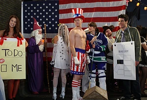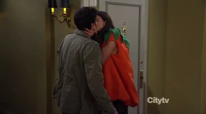 | Robin: | You reacted to Canada now! Make you a deal: you wear this costume to the Halloween party tomorrow night and I’ll drop it forever. (hands him a bag) |