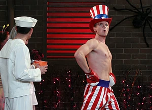 - Barney makes a grand entrance at the costume party as Apollo Creed from Rocky IV, complete with flag backdrop and James Brown's Living in America as background music.