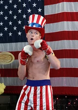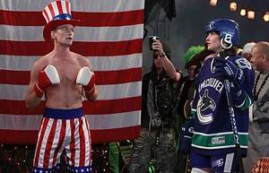 In the meantime, Robin learns from Barney's father Jerome Whittaker through Facebook that Barney's paternal grandmother was born in Manitoba, thus making Barney one-quarter Canadian. Barney is horrified and Robin goes out of her way to emphasize Barney's Canadian heritage to compensate for all the mockery she has endured from Barney over the years. She agrees to stop if Barney wears a Mountie costume for the Halloween party on the roof, but Barney resists and winds up wearing an Apollo Creed costume complete with flag backdrop and James Brown's Living in America as background music. When he returns home later, his Canadian side manifests and Barney futilely tries to beat him down.